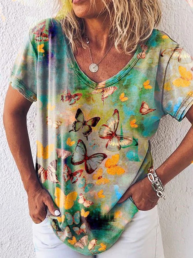 Plus Size Short Sleeve CottonBlend Floral V Neck Shirts & Tops Tops